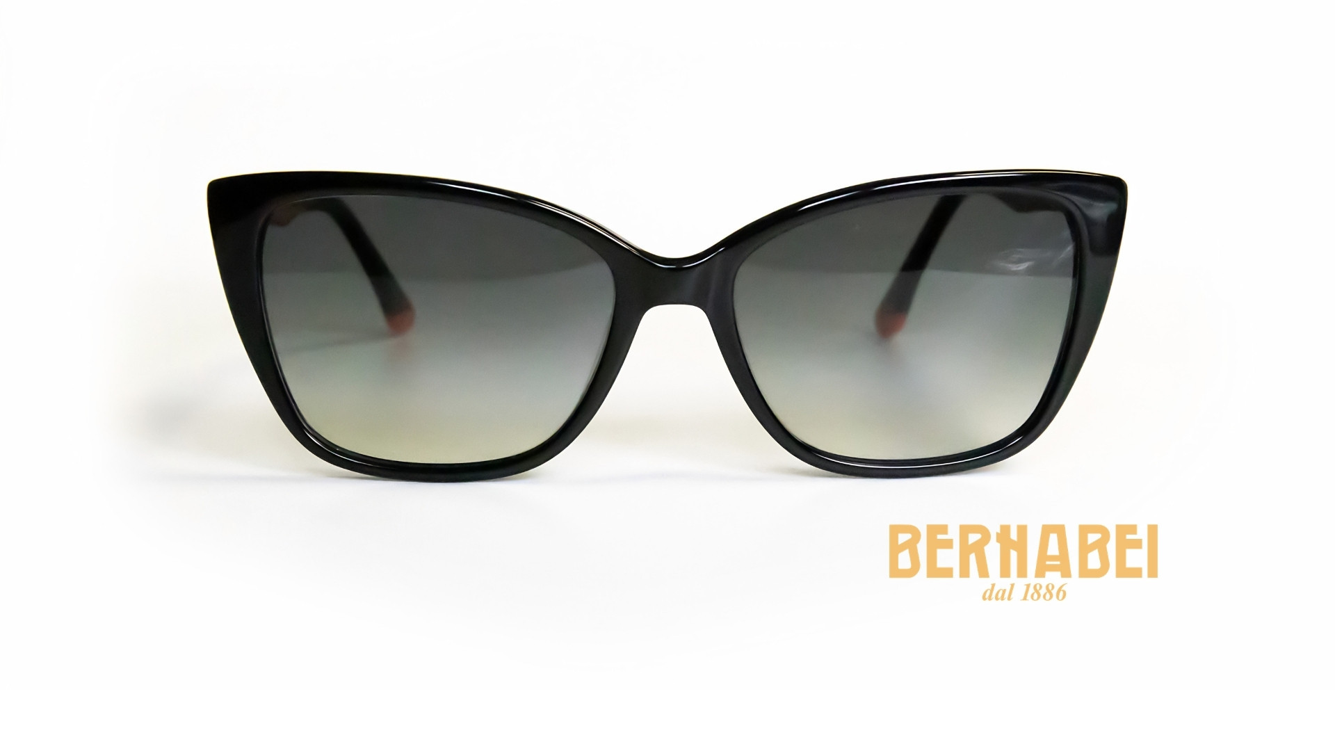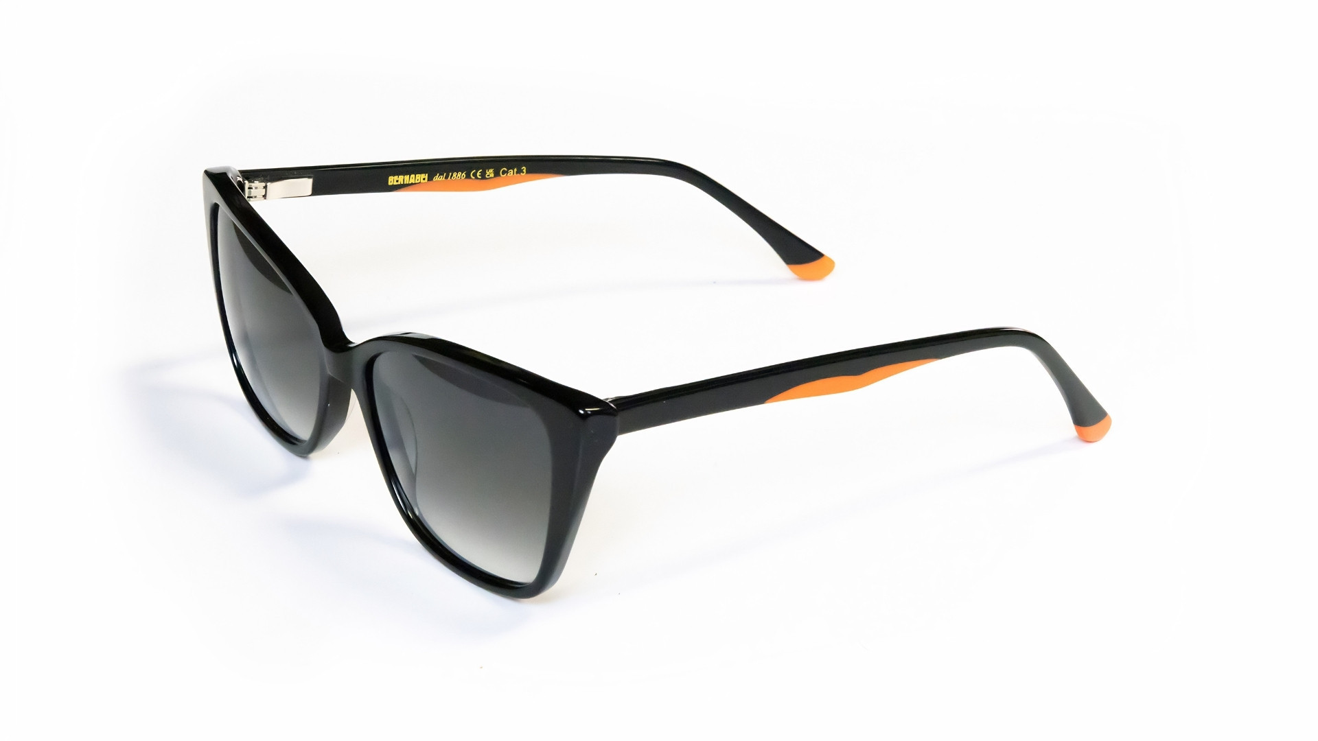 Un modello di occhiali da sole pensato per accompagnare il volto con decisione ma senza rigidità. La montatura nera in acetato di cellulosa costruisce una linea ampia e continua, leggermente sollevata agli angoli, che definisce lo sguardo mantenendo equilibrio e portabilità.