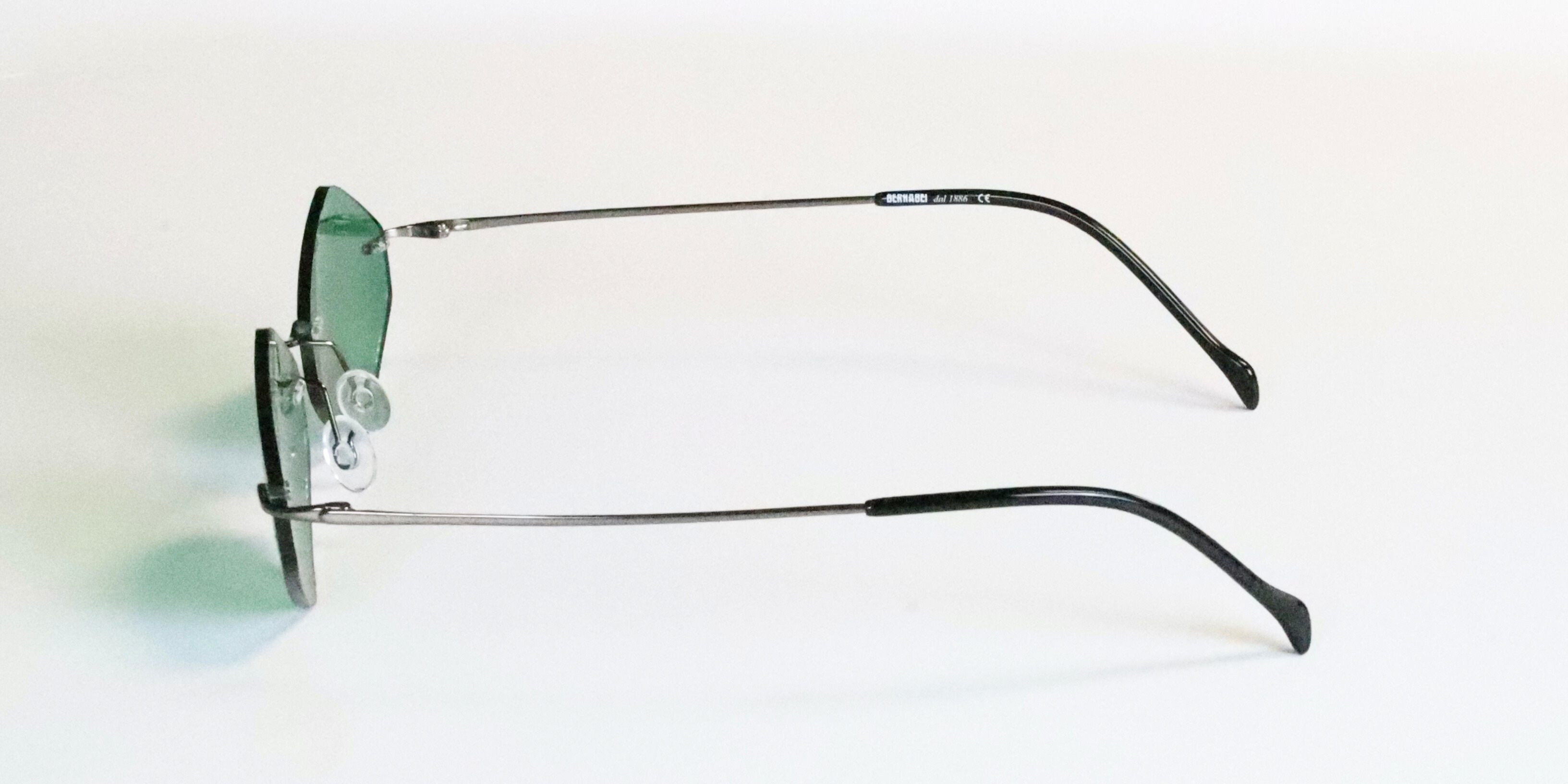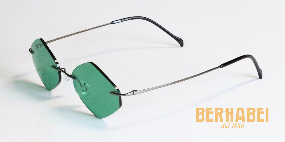 Occhiali da sole in titanio con lenti a rombo in colore verde. Un occhiale che unisce leggerezza strutturale e precisione formale. Il design rimless valorizza la geometria esagonale delle lenti, creando un equilibrio netto tra carattere e discrezione.
